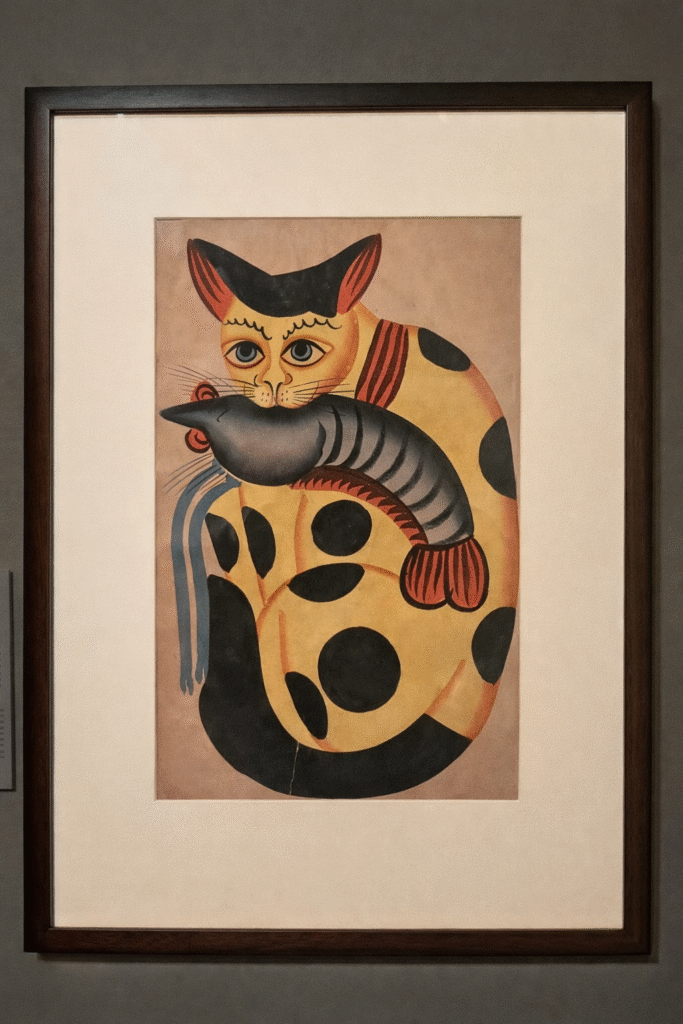 The relationship people share with their cats and dogs has long fueled conversation and shaped perception. Dogs are often cherished for their unwavering faithfulness, while cats are appreciated for their independence, returning to their owners as they wish and seeking affection on their own terms. This Kalighat painting embodies that spirit, capturing the enigmatic qualities that have fascinated cat enthusiasts for generations.