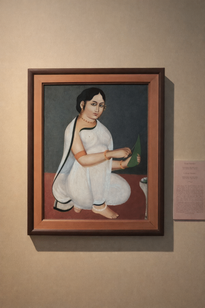 Here, Kumuda Sundari welcomes us into the closed space with her captivating eyes, confronting and inviting the voyeur as she applies slaked lime on a betel leaf. She is bedecked in gold ornaments yet wears a plain, translucent white saree, both reflecting her social status as a widow and offering the patron his coveted view. In a time when Bengali women started adopting blouses in the name of modesty, this was an artistic anomaly done only at the request of Babu. Like the female nude Venus hanging in the private quarters of a duke or king, these paintings might have hung in the bedroom of a so-called Bengali bhodrolok or gentleman.