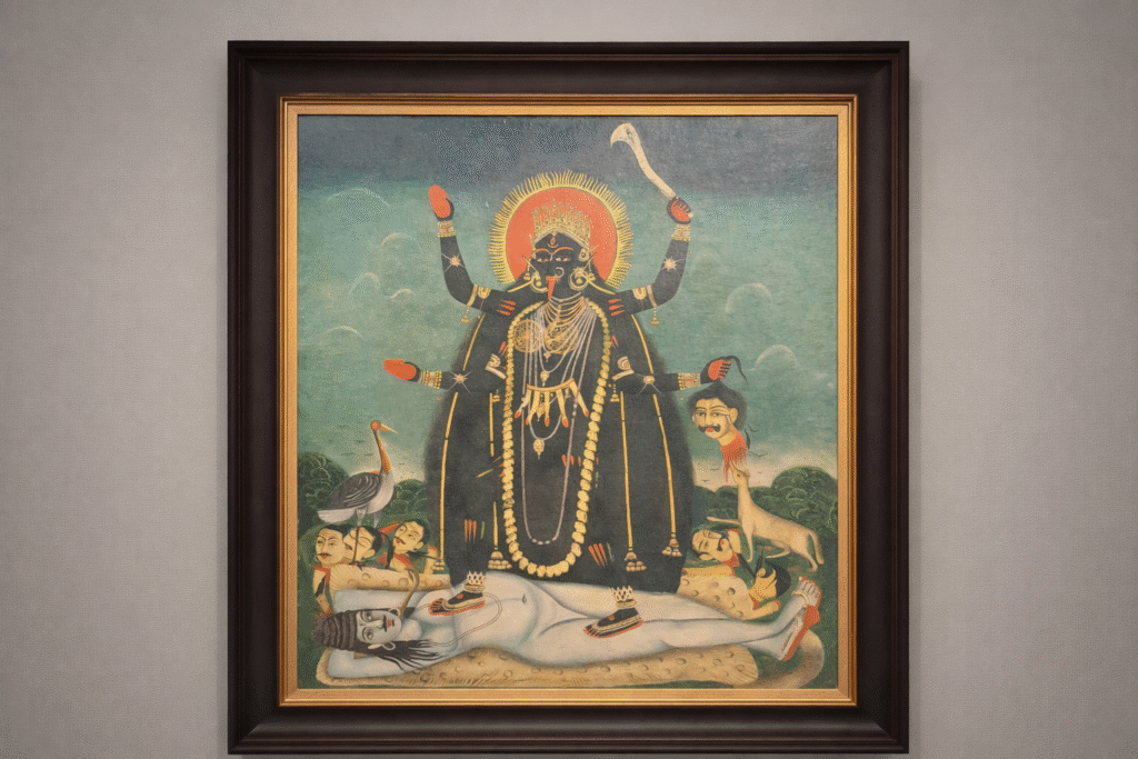At the turn of the 19th Century, as printing technology developed, printing presses like the Calcutta Art Studio, the Chorebagan Art Studio, and the Jubilee Art Studio made prints depicting deities and mythological episodes as accessible to the masses as a Kalighat painting, but with the anatomical precision of a European High Art.