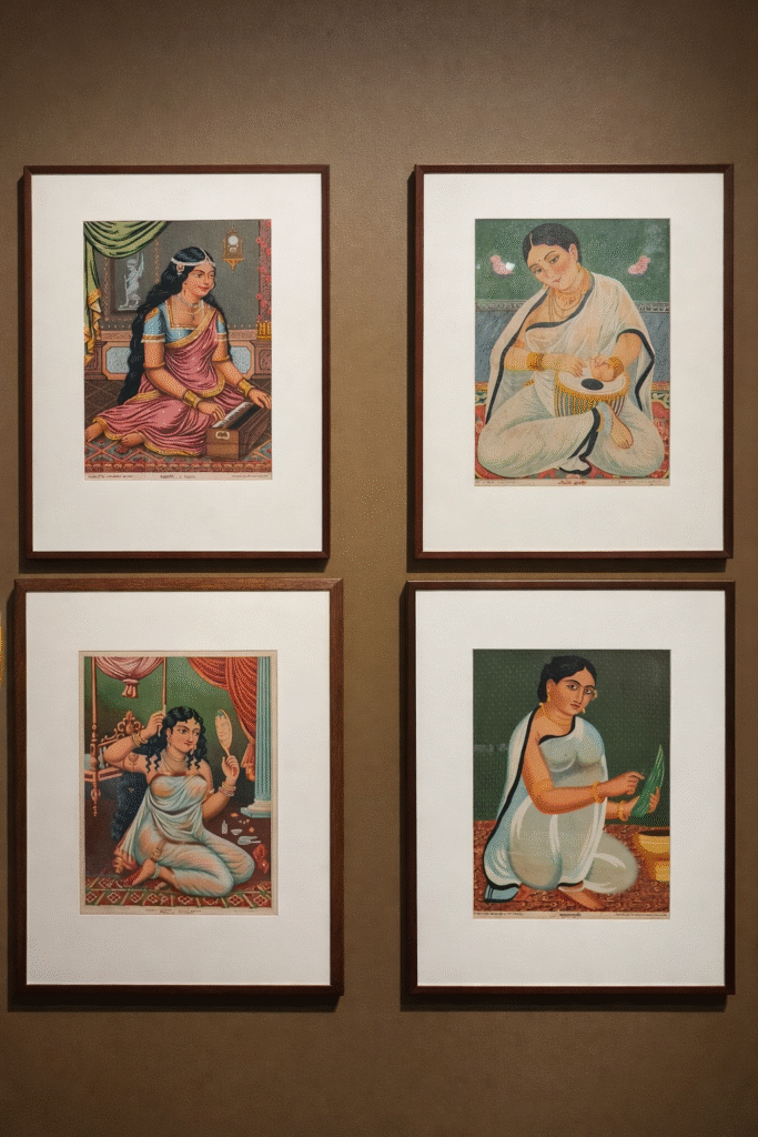 Unforgettable are those dramatic mythological paintings depicting episodes from the Ramayan and the Mahabharat, in the same light as Neo-classical European Art depicted episodes of Greek Epics. Detailing in the painting of the disrobing of Draupadi, modelled after the painting of the Darbar of Mysore.
